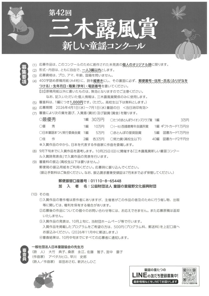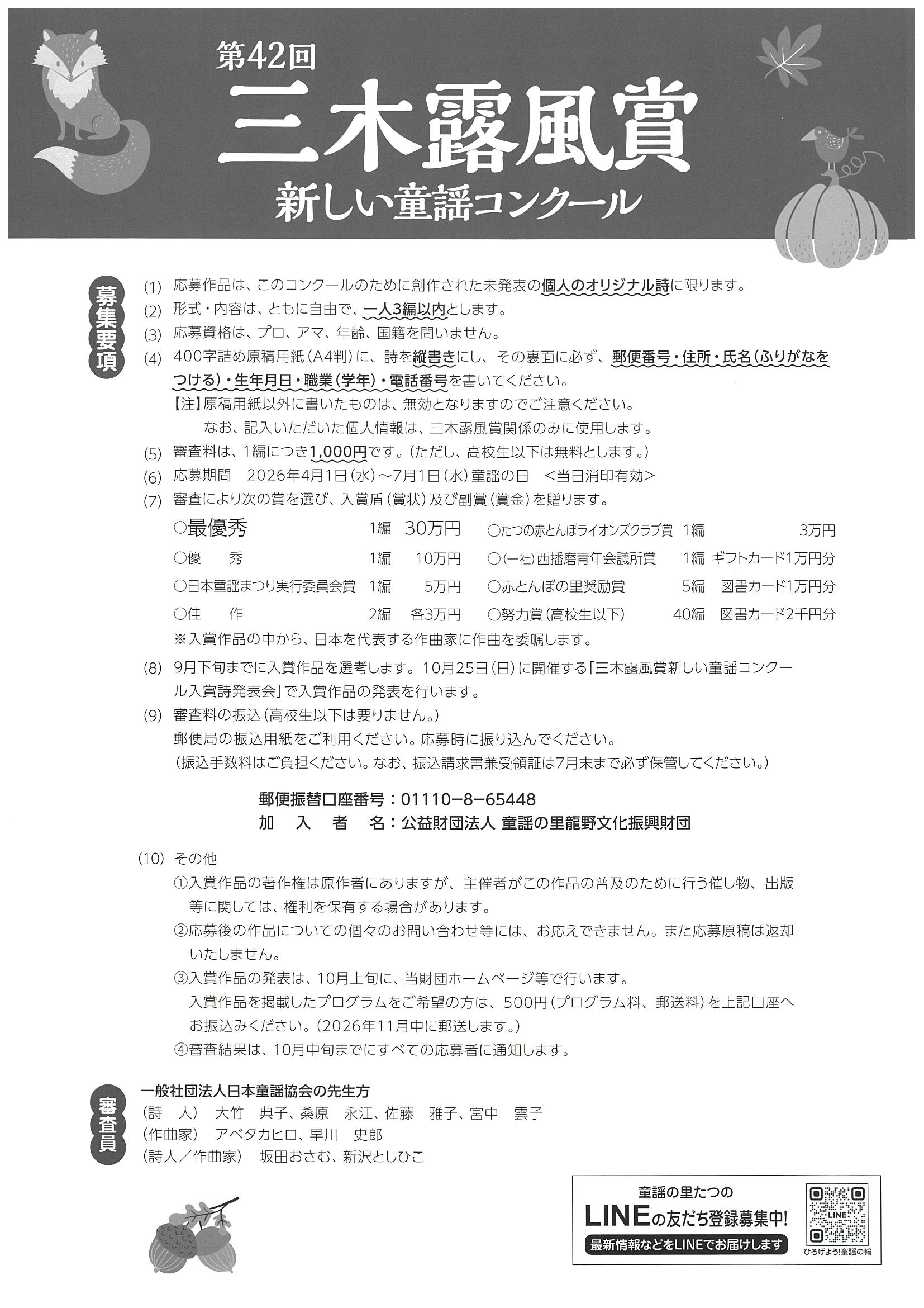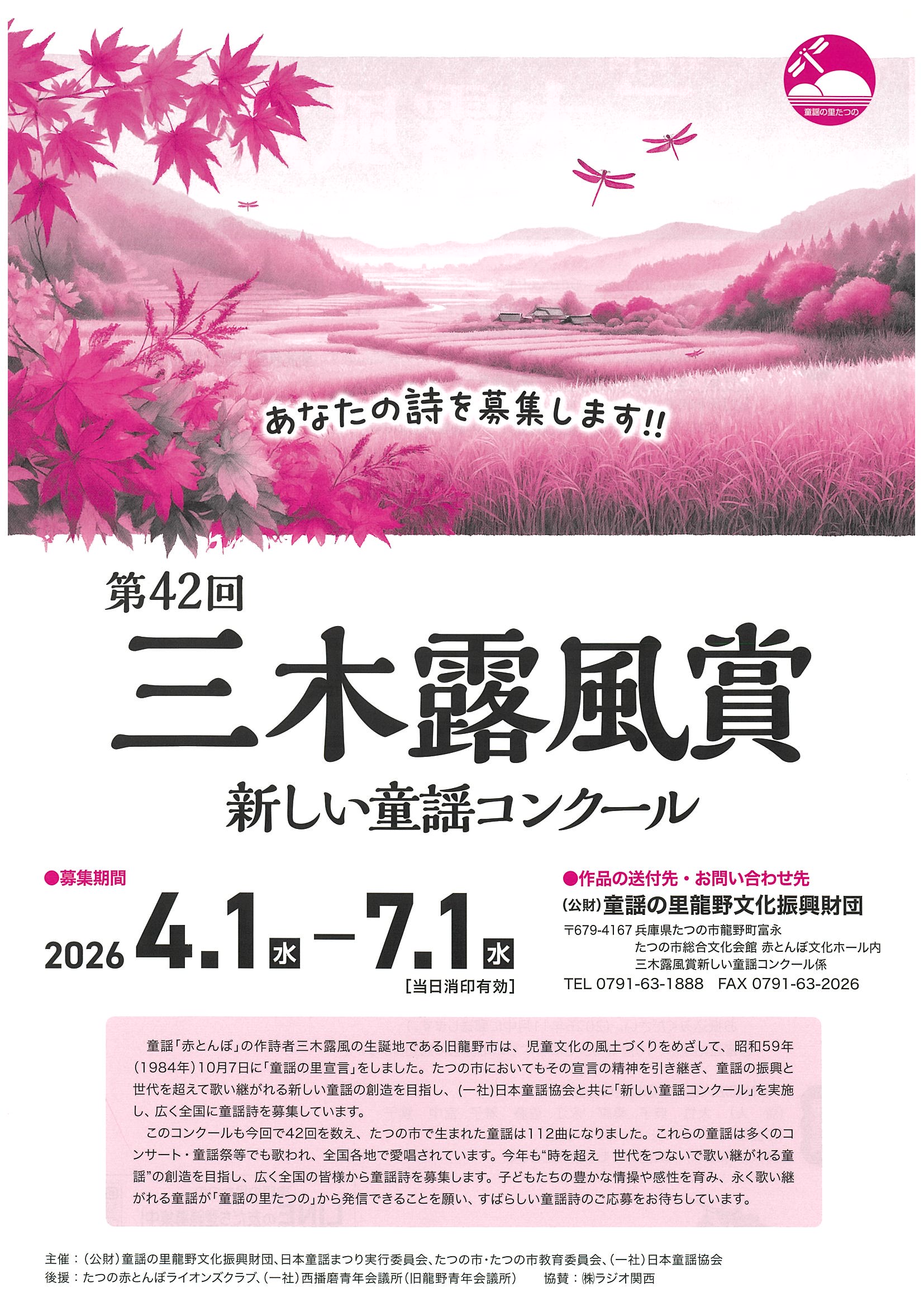 アサイド 投稿者: jimukyoku 日付: 2026年4月2日 童謡「赤とんぼ」の作詩者三木露風の生誕地である旧龍野市は、昭和59年に「童謡の里宣言」をし、現在のたつの市においてもその精神を引き継ぎ、童謡の振興と新しい童謡の創造を目指し、当協会と共に「新しい童謡コンクール」を実施しています。広く全国から童謡詩を募集します。皆様のご応募お待ちしています!!